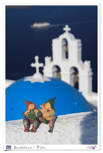 ▽橙。聖島Fira的教堂牆外,光影正美,要幫Claudia拍一張,不過她居然選涼爽的陰影下站,後來被攝影師叫去陽光下,所以可以看出有點不爽,呵呵:P